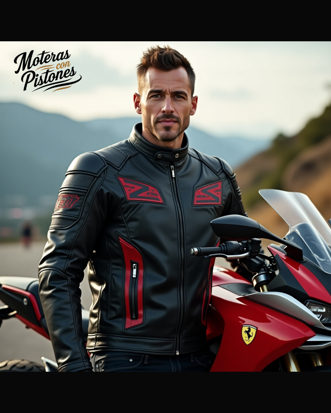 Los paneles en rojo Ferrari contrastan con el negro mate de la piel, transmitiendo una estética agresiva, moderna y elegante. Incluye forro interior microperforado, cierres YKK metálicos, ajustes en cintura y muñecas, y protecciones extraíbles para adaptarse a cada necesidad.