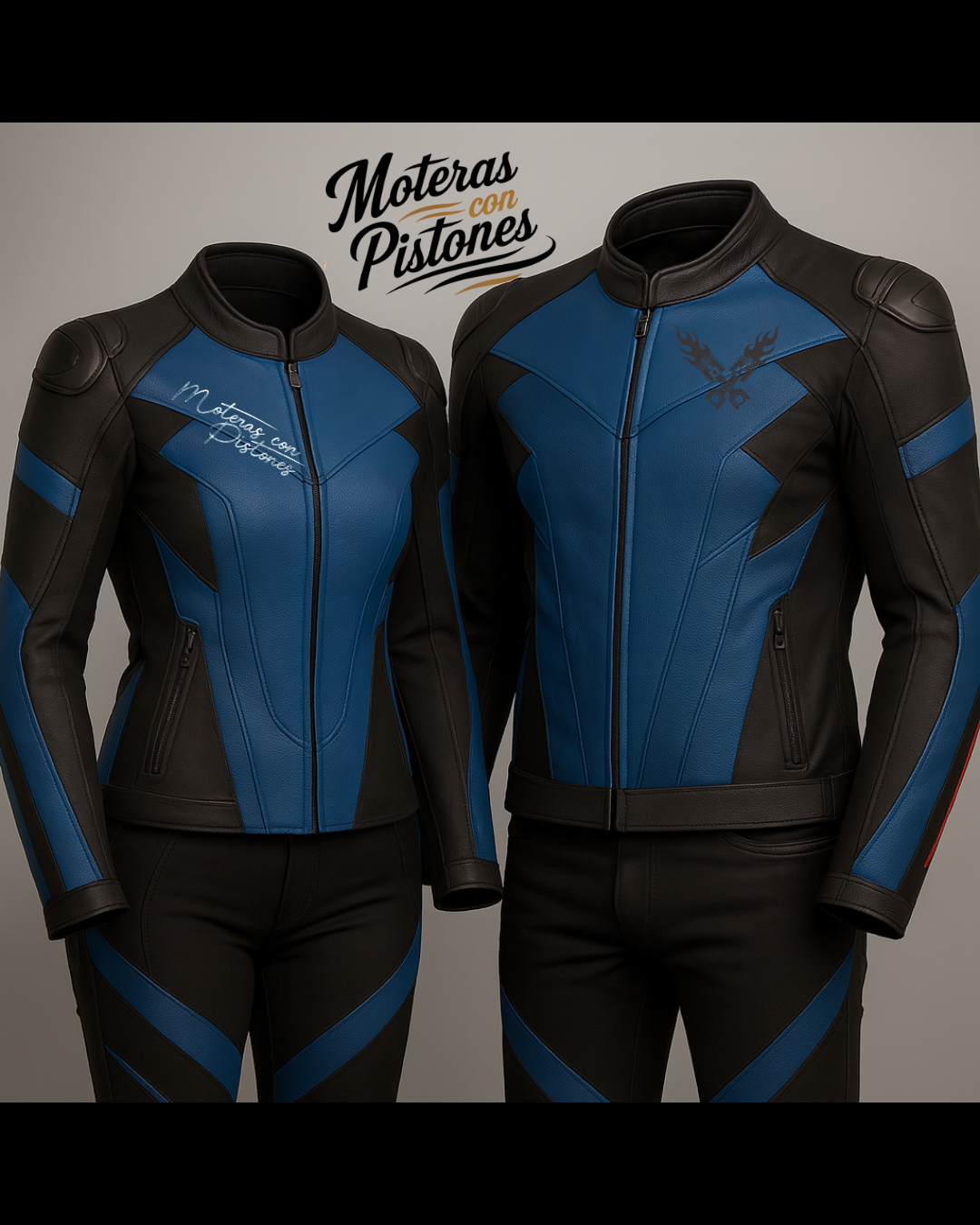 🧥 Equipación motera personalizada para pareja en azul y negro, diseñada para combinar seguridad y estilo.