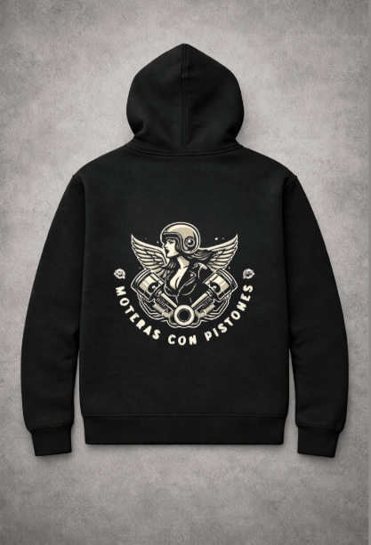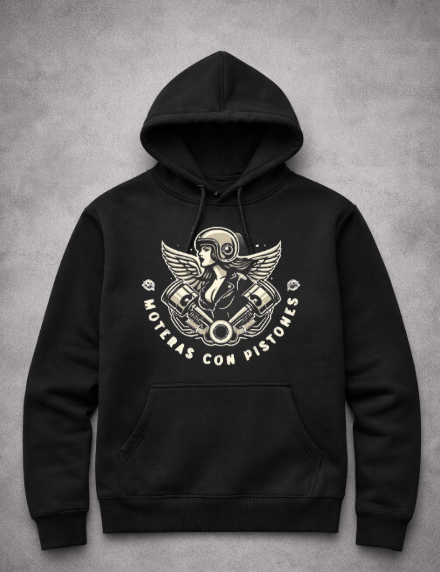 Esta sudadera no es solo ropa motera femenina: es pertenecer a una comunidad, es actitud, es libertad y es orgullo motero en cada kilómetro. Perfecta tanto para tus rutas en moto como para tu día a día, mantiene ese carácter rebelde y auténtico que define a Moteras con Pistones.
