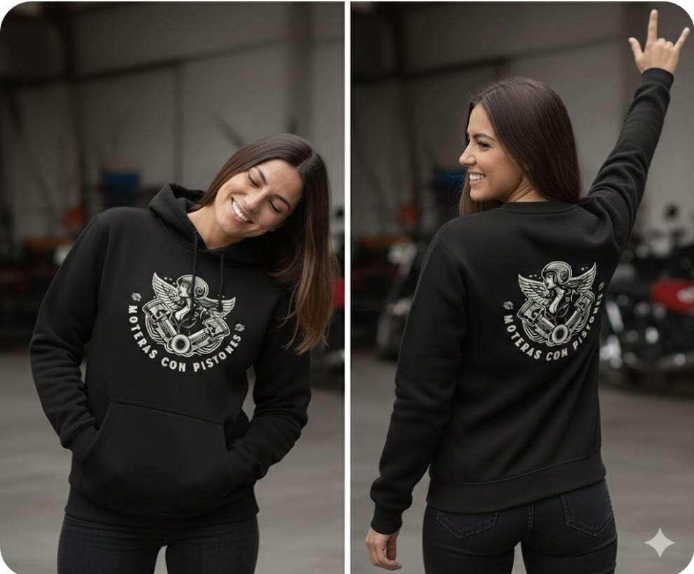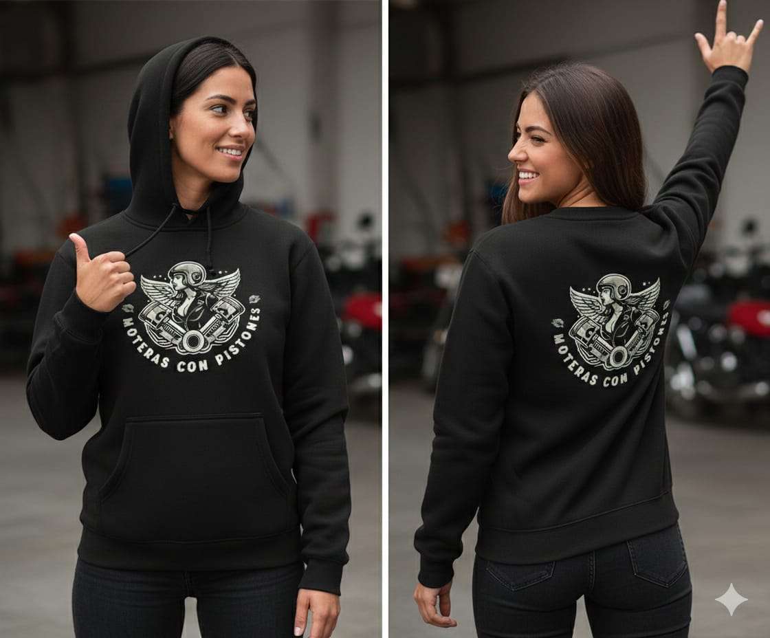Sudadera motera para mujer de Moteras con Pistones. Diseño exclusivo, comodidad y actitud motera femenina. Viste comunidad y libertad.